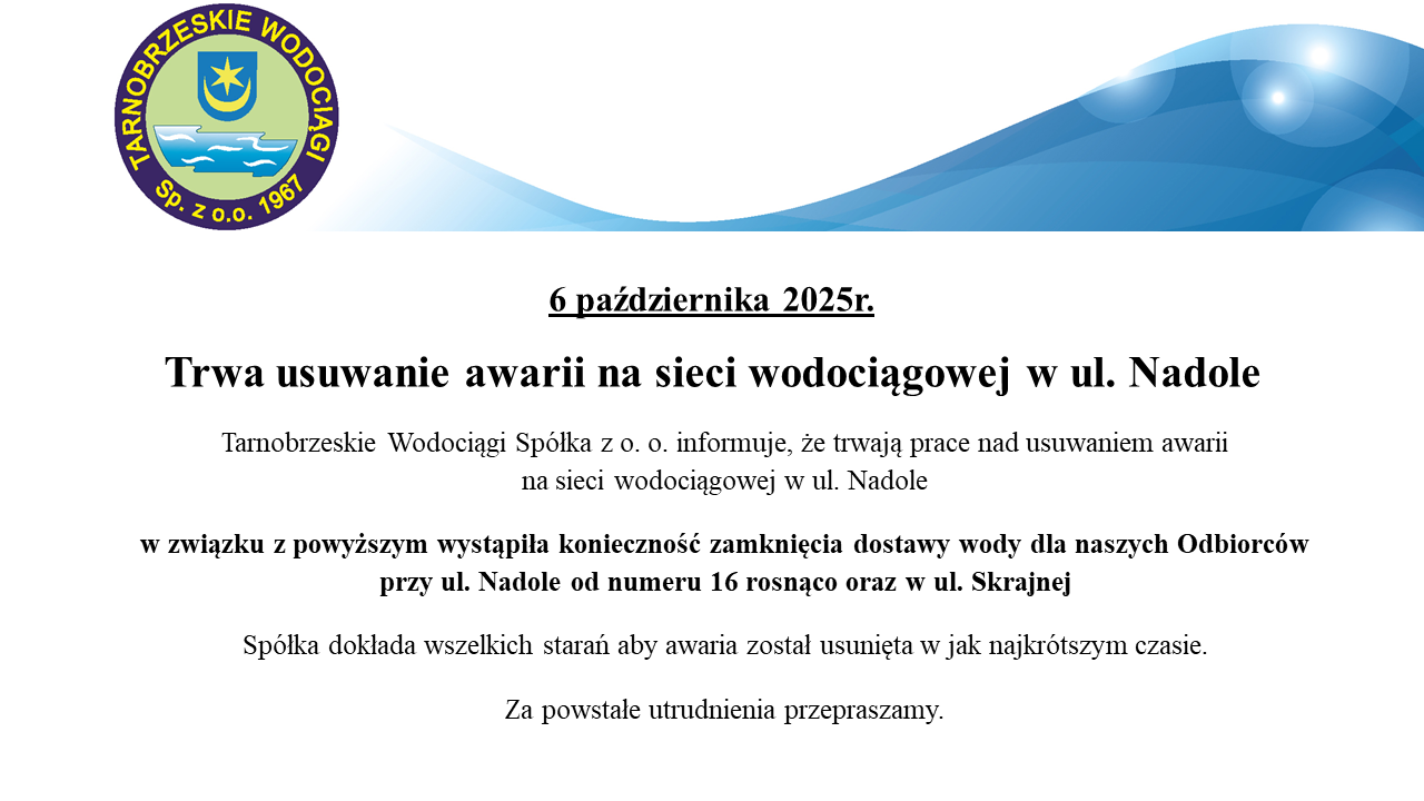 Tarnobrzeskie Wodociągi Spółka z o. o. informuje, że trwają prace nad usuwaniem awarii na sieci wodociągowej w ul. Nadole