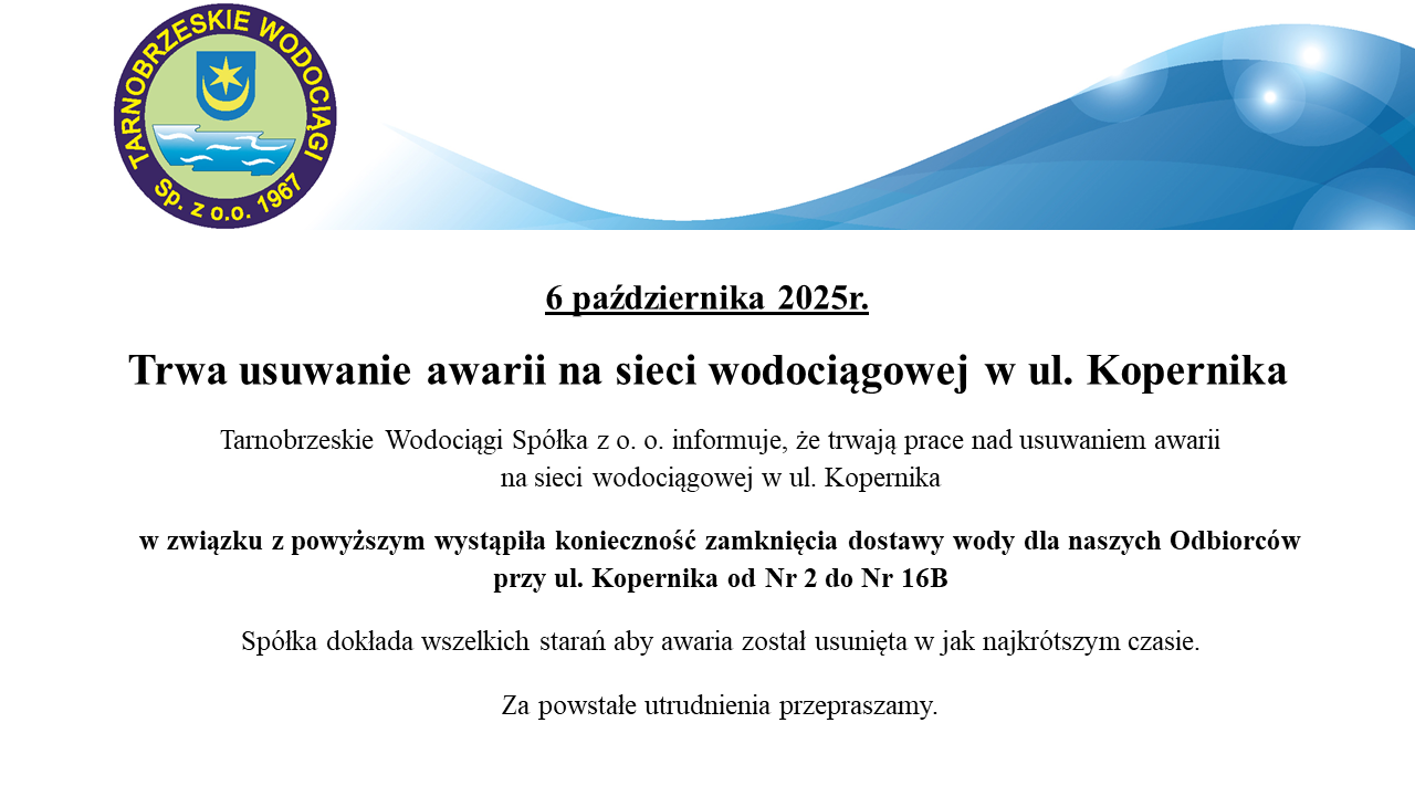 Spółka dokłada wszelkich starań aby awaria został usunięta w jak najkrótszym czasie.